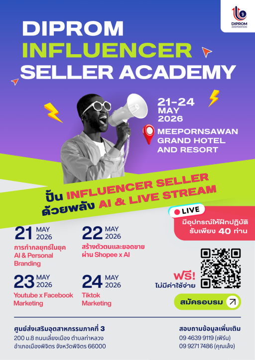 ขอเชิญผู้ประกอบการเข้าร่วมอบรมเชิงปฏิบัติการ “Diprom Influencer Seller Academy” ปั้น Influencer Seller ด้วยพลัง Ai & Live Stream