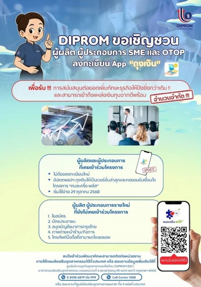 DIPROM ขอเชิญชวนผู้ผลิต ผู้ประกอบการ SME และ OTOP เข้าร่วมโครงการ “คนละครึ่ง พลัส” ผ่านแอปพลิเคชัน “ถุงเงิน”